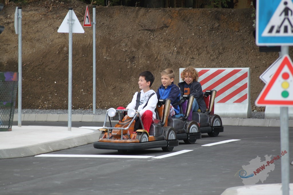 Im Junior Parcours haben die Kleinsten zwischen 90 cm und 1,20 m Körpergröße die Möglichkeit ihre ersten Erfahrungen im Straßenverkehr zu machen. Mit maximal 4 km/h geht es mit den Fahrzeugen von SELA Cars srl auf die Strecke. Für die etwas Größeren zwischen 1,21 m und maximal 1,40 m bietet der Training Parcours, inklusive Verkehrszeichen wie im richtigen Leben, spielerisch die Chance ihre Fahrprüfung mit den bis zu 7 km/h schnellen Autos ab zu legen. Besonders positiv ist es für die Kids von den Eltern begleitet zu werden. Ihnen bietet der Park bis zum Ende des Lehrfilms, in dem die Figuren Master Splinter und April die Verkehrsregeln erklären, an der Seite ihrer Kinder zu bleiben. Danach ist nur noch eine Beobachtung am Rand des Parcours möglich.